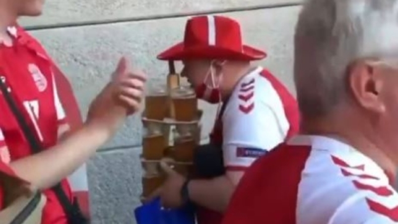 Δανός φίλαθλος έκλεψε την παράσταση, κατορθώνοντας να ισορροπήσει όταν μετέφερε 12 ποτήρια μπύρας και ένα χοτ ντογκ.